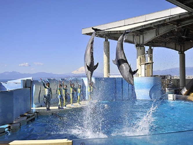 江の島と富士山を背景に繰り広げられるイルカショー等見所満載の水族館!